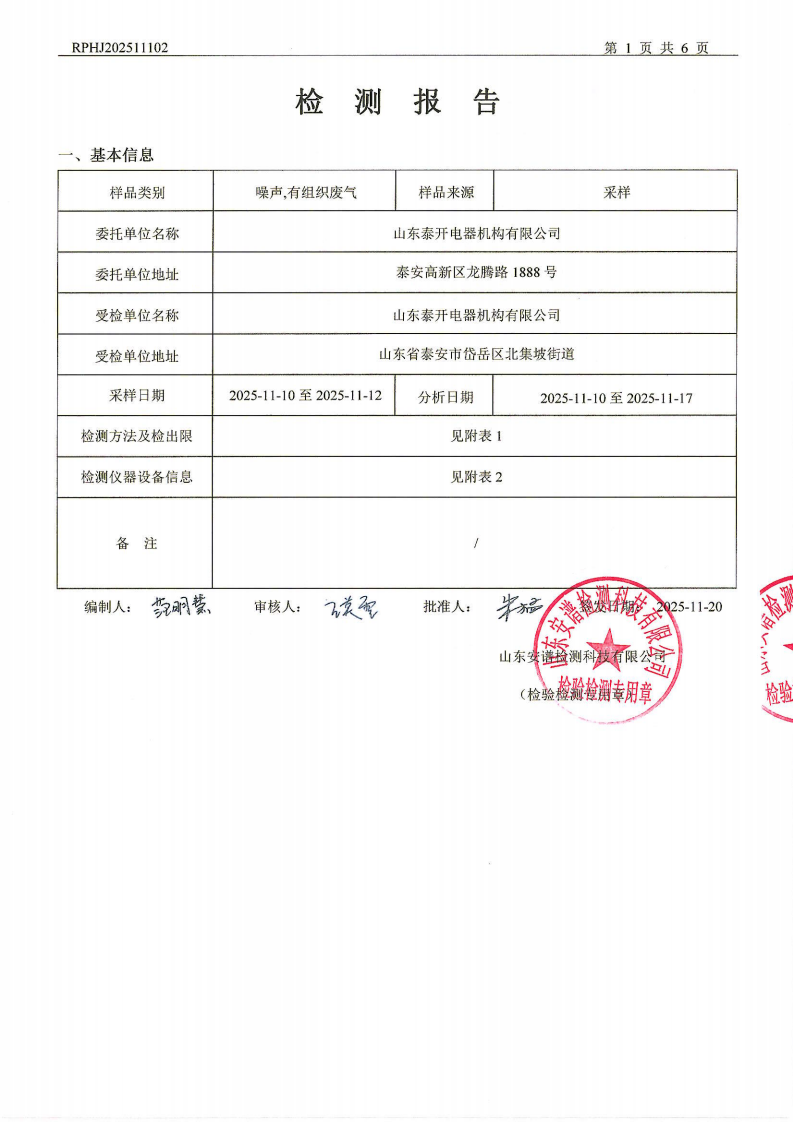 山东泰开电器机构有限公司废气、噪声检测